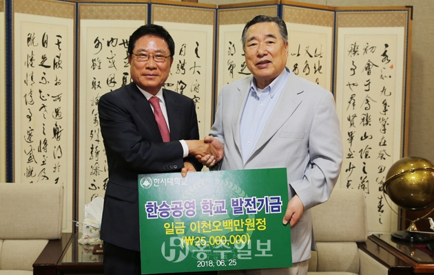 옥외광고 분야의 선두 주자인 한승공영(주)이 지난달 25일 한서대학교에 발전기금 2천5백만 원을 전달했다. 한서대학교 본관 3층 접견실에서 열린 발전기금 전달식에서 한승공영(주) 이상대 회장은 “세계적인 항공대학을 만드는 등 성공적인 특성화교육을 실시하고 있는 한서대에 큰 기대를 갖고 있다”며 “이 발전기금이 우리나라 미래를 책임질 학생들의 체력증진에 작은 도움이 되기를 바란다”고 말했다. 저작권자 © 홍주일보 무단전재 및 재배포 금지 김옥선 기자 다른기사 보기 페이스북 카카오톡 URL복사 기사공유하기