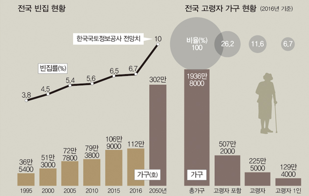 이런 상황에서 고령화가 빠르게 진행되고 있는 농촌지역의 경우 10가구 중 1가구 이상이 빈집으로 조사됐다. 게다가 출산율 저하로 젊은 층 인구가 줄어들면서 신규 주택수요도 감소하면서 빈집은 앞으로 더욱 늘어날 가능성이 있다.