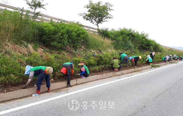 갈산면 새마을부녀회원 30여 명은 지난달 25일 아름다운 거리 조성을 위해 도로변 가로화단 제초작업을 실시했다.<사진> 이 날 부녀회는 홍성IC 진출입로 인근 가로화단에 무성하게 자란 잡초를 제거하는데 구슬땀을 흘렸다.