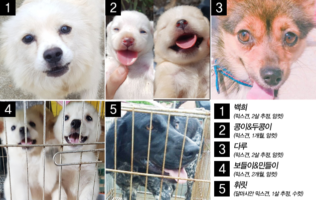 백희(믹스견, 2살 추정, 암컷)와 콩이&두콩이(믹스견, 1개월, 암컷)