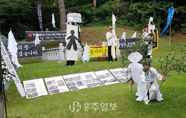 한국전쟁 전후 민간인 학살 희생자 홍성지역 합동 추모제가 지난 11일 용봉산 평화공원에서 열렸다.<사진> 이번 추모제에는 담산리 유해 21구 유가족이 함께 참석해 그 중 15명의 생체 시료 샘플을 채취했으며 그 결과는 오는 9월 중에 나올 예정이다. 이후 몸이 쇠약해서 추모제에 참석하지 못한 가족은 추가 채취할 계획이다.