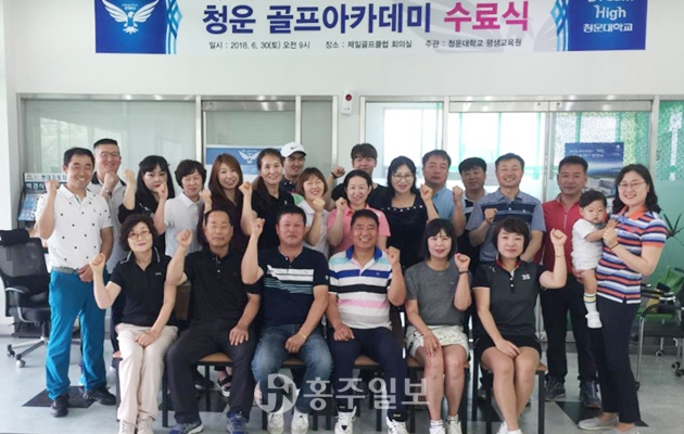 제8기 청운 골프아카데미 수료식이 지난달 30일 제일골프클럽 회의실에서 개최됐다.<사진> 청운대학교에 따르면 이번 아카데미에는 골프에 관심이 있는 일반인을 대상으로 제일골프클럽 헤드프로 최장선 강사 외 2명의 지도아래 홍동읍 소재 제일골프클럽에서 40여명의 회원이 집중교육을 받아왔으며 지난 3월 24일부터 총 15주 과정으로 매주 토요일에 진행됐다. 이날 수료식에는 수강생 및 관계자들이 참석한 가운데 평생교육원장 인사말, 수료증 수여, 공로상·감사장 전달, 기념촬영 등으로 진행됐다.