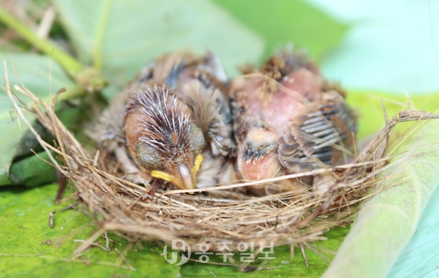 지난 12일 홍동면 신기리에서 새끼 참새 4마리가 어미 참새를 잃고 구조의 손길을 기다리고 있다.<사진>