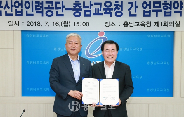 충남도교육청(교육감 김지철)은 지난 16일 한국산업인력공단(이사장 김동만)과 국가자격시험의 효율적 운영과 중·고등학생의 직업진로지도 지원을 위한 업무협약을 도교육청 회의실에서 체결했다.<사진>