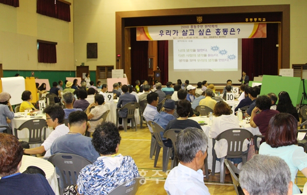 홍동면(면장 조성을)이 홍성군 11개 읍·면 중 최초로 직접 민주주의 방식으로 지역 발전을 위한 의제를 도출했다. 지난 20일 오후 2시 찌는 듯한 무더위 속에 홍동중학교 실내체육관은 삼삼오오 모여든 주민들로 가득 찬 가운데 홍동면 주민자치위원회(위원장 주정모)가 주최한 주민원탁회의가 열렸다. 이 날 주제는 ‘우리가 살고 싶은 홍동은?’이라는 주제로 사전에 공지하고 신청 받은 주민이 151명이었지만 당일 현장에서도 희망자를 받아 전체 165명의 주민이 18개 원탁에 나눠 앉아 지역 현안에 대해 토의했다.