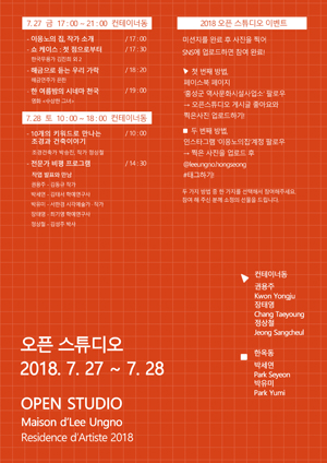 이응노의집 창작스튜디오는 국내에서 활동하는 예술가 5명을 선정해 10개월간 거주하며 작업을 지원하는 레지던시 프로그램이다. 2018 오픈스튜디오에서는 입주작가의 작업세계에 대해 알아보고, 그간의 작업물과 작업공간을 살펴볼 수 있다. 더불어 또 다른 예술가들의 공연과 이벤트도 마련된다.