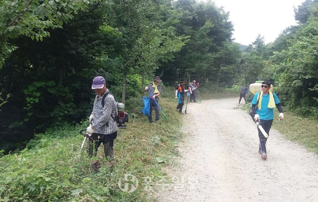 광천읍 광천이장협의회와 행정복지센터 직원 50여 명은 지난달 25일 오서산 등산로 제초작업과 환경 정비를 실시했다. 이들은 폭염 속에서 이른 아침부터 오서산 상담 주차장에 집결해 주차장~정암사에 이르는 5km 구간의 잡초를 제거하고 쓰레기를 주워 등산로 주변 환경을 쾌적하게 정비했다.<사진>