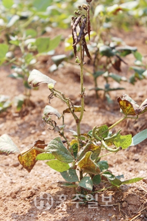 한 달째 이어지는 폭염과 가뭄으로 농작물에 비상이 걸렸다.<사진> 충남도에 따르면 지난 13일 현재 농작물 264.1ha에서 피해가 발생했으며, 작물별로는 벼 55.2ha, 전작물 71.3, 인삼 등 특작류 116ha 등이고, 가축은 닭 79만 6500수, 돼지 3081두 등 총 80만 4581마리가 폐사했다. 이에 도는 밭작물 가뭄 피해 최소화를 위해 시·군별로 필요한 자재를 조사했으며, 시·군 수요에 따라 관개가 어려운 밭 중심으로 중·단기적으로 사용가능한 임시양수시설, 송수시설, 물탱크, 스프링클러, 장비임차 등에 긴급 예비비를 투입, 사용될 예정이다.