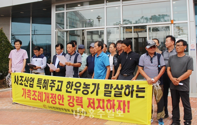(사)전국한우협회 홍성군지부는 공청회 전 광천문예회관 앞에서 기자회견을 열고 “홍성군 내 한우 농가 중 50마리 미만이 1천724가구로 전체의 86.2%에 달할 정도로 열악한 실정”이라며 “대부분 고령인 데다 소규모 농가인데 신축 금지에 해당하는 이번 조례가 통과될 경우 극빈층 전락이 우려되며 귀농·귀촌 인구 감소로 인해 홍성군의 경쟁력도 떨어질 것으로 우려된다”고 주장했다. 이어 열린 공청회는 홍주신문 한관우 대표가 좌장을 맡은 가운데 이두원 전 홍성군의원, 양돈사육농가를 운영하는 이희영, 홍성군지속가능발전협의회 이도헌 위원, 예산홍성환경운동연합 조성미 의장, 장곡면 광성2리 이종구 이장, 환경전문가 김해룡 등이 패널로 참석했다.