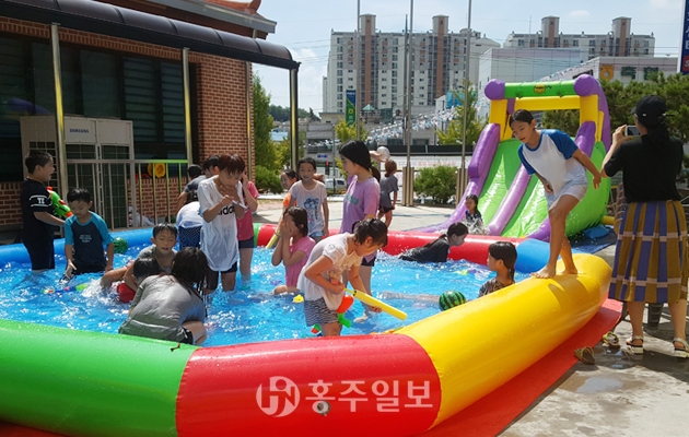 홍성읍 자원봉사 거점센터에서는 홍성군자원봉사 센터의 후원과 홍성지역 RCY와 홍성적십자협의회의 협찬을 받아 홍주천년 아동센터 학생 20여 명을 초대해 무더위극복 프로젝트 여름물놀이 행사를 진행했다.<사진>
