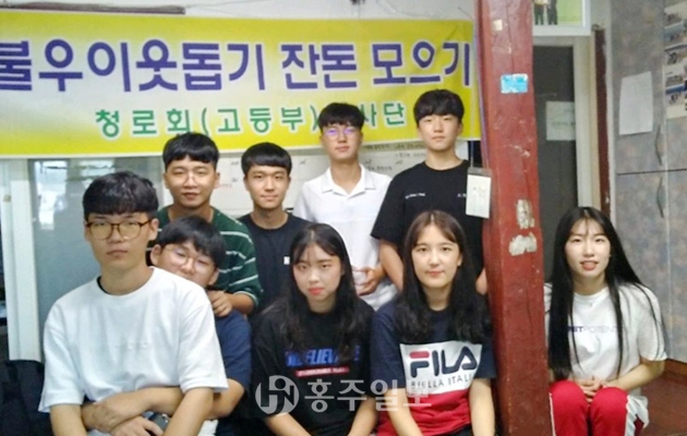 홍성군 청소년 자원봉사단 청로회(회장 이철이) 학생들이 지난 1일 우주은하아파트 밑에 위치한 구 쉼터에서 잔돈 모으기 활동을 펼쳤다. <사진>