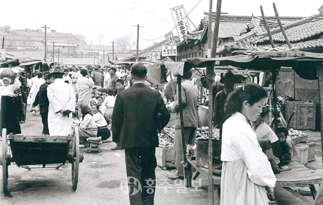 1950~51년 가을 한국의 어느 도시 대목시장 풍경. 사과 등의 과일상자와 곡식 가마가 눈에 들어오고 대부분 사람들의 복장이 한복차림인데 비해 신사복을 입은 사람 앞으로 활짝 웃는 아낙의 모습이 눈에 띈다. 바삐 움직이거나 앉아 있는 사람들 사이로 한자로 된 간판과 술, 물감 등의 한글간판이 보인다.
