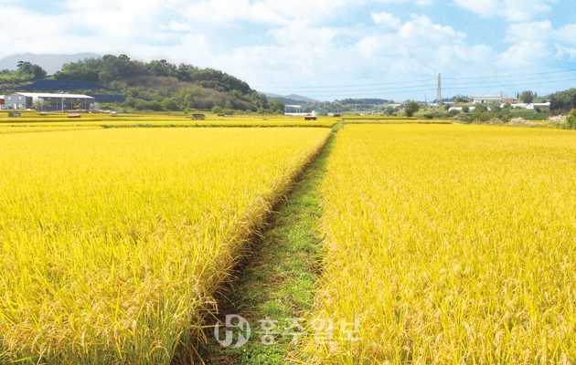 가을이 익어가며 홍성 이곳저곳이 황금들녘으로 일렁인다. 홍동면 금평리 황금빛 들녘은 청명한 가을하늘 아래 추수의 계절이 왔음을 알린다. 지난 폭염으로 농부의 마음을 졸이게도 했지만 벼는 그런 농부의 마음을 아는지 탐스럽게 쌀알을 영글었다. 자연이 주는 혜택과 풍요로움에 감사하며 절로 고개가 숙여지는 풍경이다.