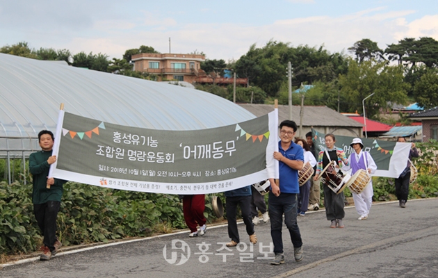 홍성유기농영농조합(대표 정상진) 명랑운동회 ‘어깨동무’가 지난 1일 홍성유기농조합에서 조합원과 주민 70여 명이 참석해 진행됐다. 조합원 풍물패의 신나는 풍물로 시작된 명랑운동회는 조합원들의 화합과 단합을 도모하기 위해 개최됐다.