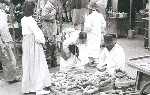 한국전쟁(1950~1953) 중에도 시골장터의 풍경은 오히려 평화롭다. 특히 남자와 여자들의 복장과 모자, 비녀와 머리핀을 꽂은 여자들의 머리 모양이 대조를 이루는 모습이다. 곡물전으로 추정되는 노점에서 어린아이를 등에 업은 여인이 곡물장수와 흥정하는 모습과 함께 지게를 진 지게꾼의 모습이 이채롭다. 지게꾼과 장꾼들의 복장이 대조를 이루고 있다.