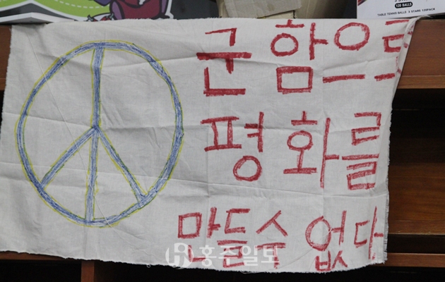 자전거 앞에는 광목천에 서툴지만 강한 힘으로 쓴 ‘강정에서 평화가 시작 되리라’, ‘제주 해군기지 국제관함식 결사반대’, ‘군함으로 평화를 만들 수 없다’, ‘평화는 평화로 지킨다’등의 작은 피켓이 걸려 있다.