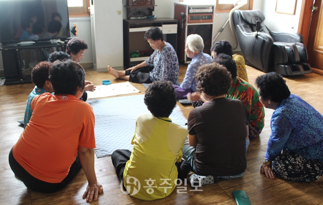 윷놀이만 하는 건 아니다. 일주일에 두 번 한글교실도 한다. 서투른 손놀림으로 연필 끝에 침을 묻혀가며 칸칸이 글씨를 써내려가는 재미도 쏠쏠하다. 내 이름자 정도만 쓸 줄 알면 된다고 한사코 안 하려고 하는 할머니들도 하나 둘 책상 앞에 불러 앉혀 같이 배우는 맛이 있는 시간이다.