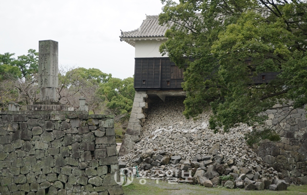 지난 9월말 기자는 구마모토성을 방문했지만 지진의 여파로 성 안에는 들어갈 수 있었지만 성안의 무너진 건물을 복원 중이라 들어갈 수는 없었다. 하지만 성 바깥의 무너진 망루 등은 일부러 관람객들이 사진을 찍을 수 있도록 관리소 측에서 자리를 마련해 두고 있었다. 성 인근에는 ‘구마모토 대지진을 잊지 말자’는 캠페인 포스터 등을 쉽게 볼 수도 있었다. 그리고 성안의 잔디밭에는 붕괴된 성벽의 성 돌들을 나란히 놓고 성돌 하나하나에 일일이 번호를 써 놓았다. 복구할 때 그 번호대로 성 돌을 쌓아 원형에 최대한 가까운 성을 복원하는 일이 일본의 문화재 복구 자세이며, 문화재 복구정신임을 읽을 수 있는 광경이었다.