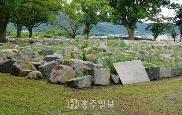 이렇듯 지진은 언제 어떤 식으로 발생할지 모르는 공포 속으로 사람들을 끌고 가는 법이다. 구마모토지진 당시 사상자는 1100명을 넘겼다. 이 지진으로 구마모토 성터의 돌담은 용암처럼 흘러내렸던 것이다. 이러한 비극의 현장은 이제 무너져 내린 성 돌들을 해체하면서 주변은 온통 암석의 전시장을 방불케 하고 있었다. 구마모토는 비극의 세월이 흘러 복원이라는 희망의 시기로 접어들고 있었다. 구마모토 시내가 한눈으로 펼쳐지는 시청 전망대와 구마모토 성안에서 보이는 광경은 크레인이 호위하는 가운데 구조물의 보호대를 찬 대천수각이 보이지만, 무성한 나뭇가지에 가려진다. 무너진 구마모토 성터의 성벽 돌은 일일이 번호를 매겨 기록된 위치에 다시 쌓일 예정이다. “복원 작업에 향후 붕괴까지 예방하자는 의지가 녹아 있다”는 것이 해설사의 설명이다. 구마모토 지진의 상흔은 아직도 그렇게 서서히 치유되고 있었다.