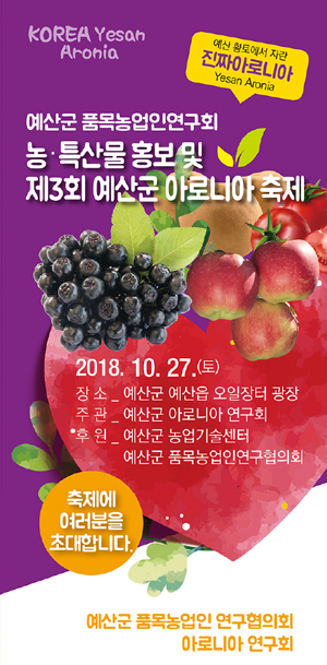 예산군품목농업인연구회(회장 박진수)는 오는 27일 예산읍 5일 장터(예산읍 전통시장)에서 품목농업인연구회 농·특산물 홍보 행사 및 제3회 아로니아 축제를 개최한다고 밝혔다.<사진>