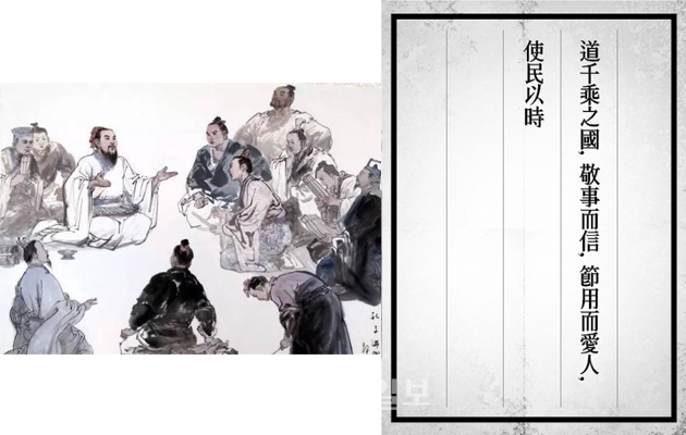 공자 왈 “道千乘之國, 敬事而信, 節用而愛人, 使民以時 천승(千乘)의 나라를 다스릴 때에는 (반드시 염두에 두어야 할 일이 있다) 국사(國事)를 처리할 때에는 일처리를 신중히 해서 백성들이 믿고 따를 수 있도록 해야 하고, (재물을 사용할 때에는) 쓰기를 절약해 백성들의 부담을 덜어줘야 하고, 백성들을 부릴 때에는 때에 맞게 시행해 (백성들의 생업에 폐해를 주지 않도록 해야) 한다.”