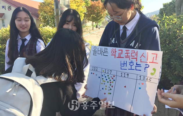 홍성여고 우현민 학생은 “평소 학교폭력 예방에 대해 관심이 많았는데 직접 캠페인을 진행하며 학교폭력을 예방하는 데 도움이 된 것 같아 기분이 좋다”고 말했다.