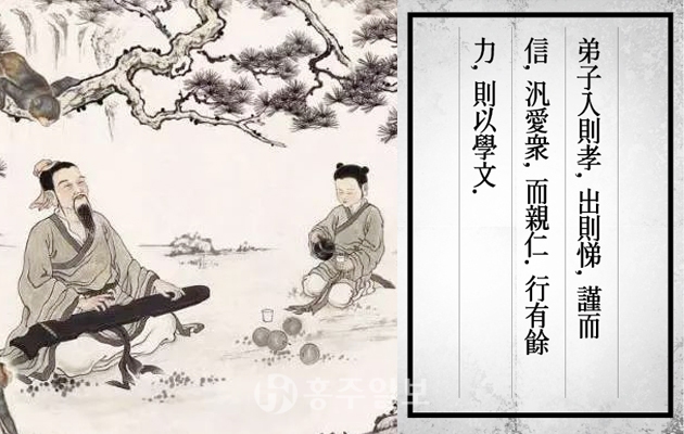 공자 왈 “제자 된 자의 도리는 들어와서는 효도하고, 나아가서는 공손하고, 행실에는 떳떳함이 있어 믿음을 줄 수 있어야 하고, 널리 사람들을 사랑하되 특히 어진 이와 친하게 지내야 하며, 그렇게 하고도 남는 힘이 있을 때는 틈틈이 선현들이 남긴 글을 읽어 도리의 당연한 모습을 알려고 노력해야 한다.”