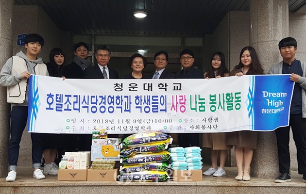 청운대학교(총장 이상렬)는 지난 9일 호텔조리식당경영학과 박충호 학우 외 6명이 교내에서 진행한 야시장 수익금 전액을 생필품 및 문구류 등을 구입해 사회복지법인 사랑샘에 전달했다고 밝혔다.