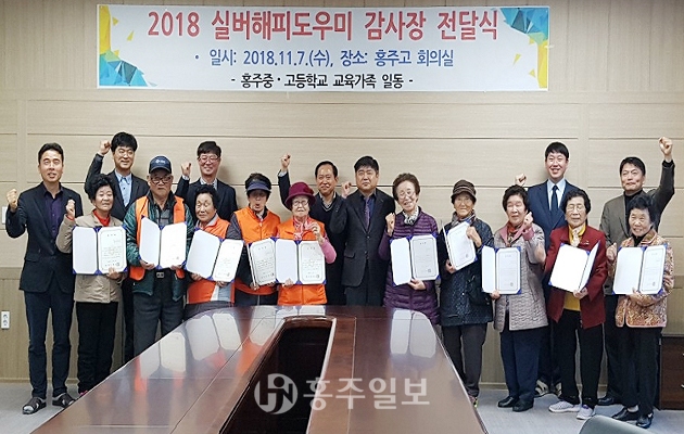 홍주중학교(교장 이계엽)와 홍주고등학교(교장 구철모)는 2018 실버해피도우미 감사장 전달식을 지난 7일 홍주고 회의실에서 진행했다.<사진>