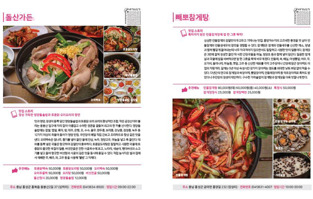 홍성의 맛집으로는 돌산가든(영양돌솥밥, 토종닭,오리 오리), 빼뽀참게탕(민물 참게탕), 산울림(오리황토진흙구이), 예당큰집(한정식), 지산흙돌(흙돼지 갈비, 코다리 찜), 한우본(1등급 홍성한우)이 수록됐다. 도는 이번 책자를 전국 공공기관, 관광공사 및 관광협회, 고속도로·국도변 휴게소 등에 비치해 국내·외 관광객들에게 충남의 맛과 멋을 홍보할 예정이다.