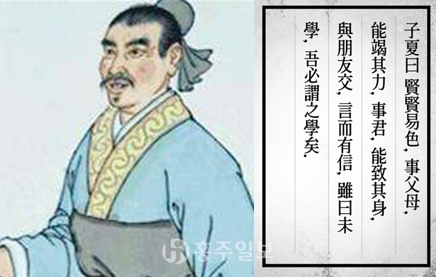 자하가 말했다. “어진 이를 어질게 여기되 색을 좋아하는 마음과 바꿔서 하며, 부모를 섬길 때 그 힘을 다하며, 임금을 섬길 때 능히 그 몸을 바치며, 붕우와 더불어 사귈 때 말에 성실함이 있으면, 비록 배우지 않았다 하더라도 나는 반드시 그를 배웠다고 하리라.”