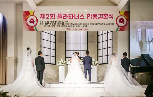 한국법무보호복지공단 충남지부(지부장 김홍두)가 주최하는 ‘제2회 플라타너스 합동결혼식’이 지난 14일 리첸시아 웨딩홀에서 법사랑위원 홍성지역연합회, 리첸시아 웨딩홀, 충남지부 운영위원회 및 보호위원회 등의 후원으로 3쌍의 합동결혼식을 개최했다.<사진>