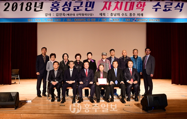 홍성군이 주최하고 혜전대학교(평생교육원)가 주관한 2018년 홍성군민자치대학이 지난 16일 홍성문화원에서 수료식을 열어 올해 교육을 마무리했다. 자치대학은 지난 3월 개강 후 건강·예술·역사·정치 등 전문 강사를 초청해 7회에 걸친 강의로 진행됐다.