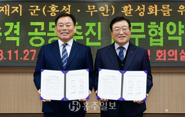 군은 지난 27일 홍성군청 회의실에서 무안군과 함께 시 승격을 위한 공동추진 업무협약을 체결했다. 군은 지난해 7월 행정안전부와 충남도에 지방자치법 개정을 건의하며 지난 8월 전남 무안군과 함께 시 승격 공동 추진 협의를 시작했다. 이어 지난 10월 말 군의 활성화를 위한 시 승격 추진 기본계획을 수립한 후 지난 8일에는 김석환 군수가 서삼석 국회의원을 만나 시 승격 관련 협의를 진행했다.