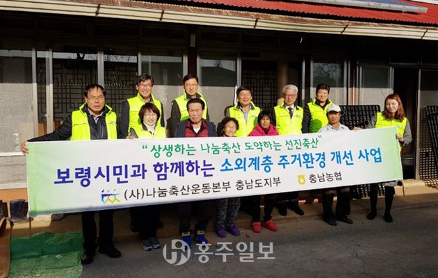 농협 충남지역본부(본부장 조소행)와 나눔축산운동본부 충남도지부(지부장 정문영)는 지난 10월 보령시에서 소외계층 주거환경 개선작업 봉사활동을 실시했다. 이번 봉사활동은 소외계층 4가구를 선정해 낡은 벽지와 장판 등을 교체해 주거환경을 개선했다.