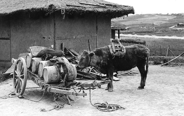 1950년대 초 우리나라 시골마을의 한적한 풍경이다. 새로 지은 듯한 초가집에는 이엉으로 지붕을 덮었고 새끼줄로 묶어 놓았다. 마당에는 소달구지(일본식으로는 소 구루마)라 불렸던 우마차가 놓여 있으며, 우마차에는 액체를 담을 수 있을 것으로 추정되는 통 네 개가 살려 있고, 통 위에는 가마니가 덮여져 있다. 방금 전까지 우마차를 끌었던 것으로 보이는 암소 한마리가 잔등에는 우마차를 끌 때 필요한 기구인 멍에와 채결장비가 올려 져 있고 우마차를 바라보고 서 있다. 사진 오른쪽에 보이는 널찍한 벌판으로 볼 때 한적한 시골마을의 한가로운 풍경이다.