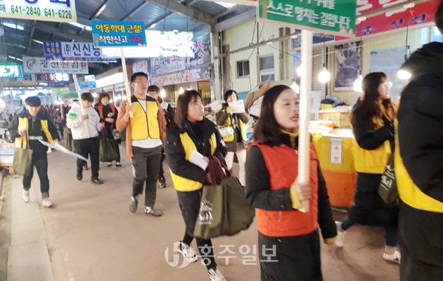 홍성군아동·여성안전지역연대는 성폭력·가정폭력 추방주간을 맞아 지난달 29일 광천전통시장 일원에서 혜전대학교 학생 20명과 함께 ‘성폭력·가정폭력 추방’ 캠페인을 전개했다.<사진>