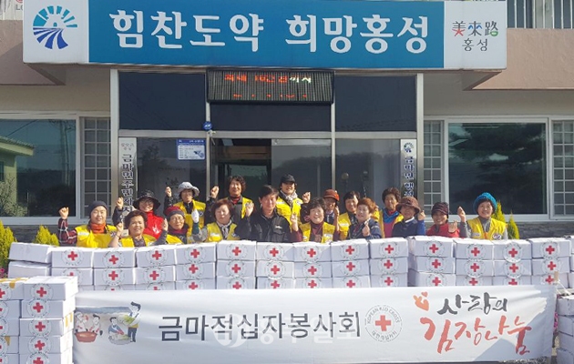 ▲ 지난달 13일 금마면에서 적십자봉사회원 30명과 마을복지사들이 300여 포기의 김장김치를 담가 어려운 가정 및 중대본부 등 100여 가구에 전달했다.