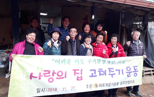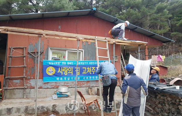 ▲ 서부면에서도 지난달 29일 바르게살기위원회 위원 30여 명이 묵동 고 모 씨 댁을 찾아가 집수리 봉사활동을 펼쳤다. 고 씨의 집은 항상 비가 오면 지붕이 새 추운 겨울을 날 것이 어려웠는데 집수리 봉사활동으로 불편한 사항이 해소됐다. 맹동수 바르게살기위원장은 “앞으로도 취약계층이나 복지사각지대에 있는 가구에 대해 지속적으로 집수리 봉사를 해 나갈 계획”이라고 말했다.