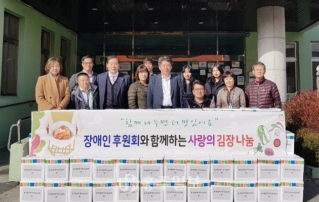 ▲ 홍성군장애인후원회(회장 이병석)는 홍성군장애인종합복지관에 김장김치 750kg를 지난달 29일에 전달했다. 이번 김장김치는 장애인, 군내 복지시설, 장애인보호작업장 등 6개 단체 150여명에게 전달돼 나눔의 정을 실천했다.