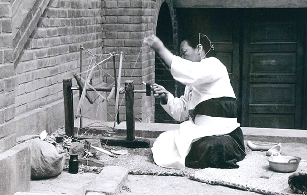 한국전쟁 중인데도 한 여인이 검정색 치마에 흰색 저고리와 앞치마를 하고 물레를 돌리고 있는 모습이 오히려 평화롭다. 건물 바깥마당으로 보이는 곳에 가마니를 깔고 앉아 물레를 돌리고 있다. 가마니 옆에 벗어 놓은 흰색 고무신과 가마니 위의 냄비가 대조를 이루고 있다. 물레 옆의 봇짐과 기름병으로 보이는 병이 이채롭다. 중국에서 목화씨를 전래한 문익점(文益漸)의 손자 래(萊)가 목화씨에서 실을 자아내는 틀을 발명했다고 해서 ‘문래’라 부른 것이 변이돼 ‘물레’가 됐다고 전해진다. 농가월령가에는 ‘물네’, 월여농가(月餘農歌)에는 ‘방차(紡車)’ 또는 ‘문레’로 표기돼 있다.