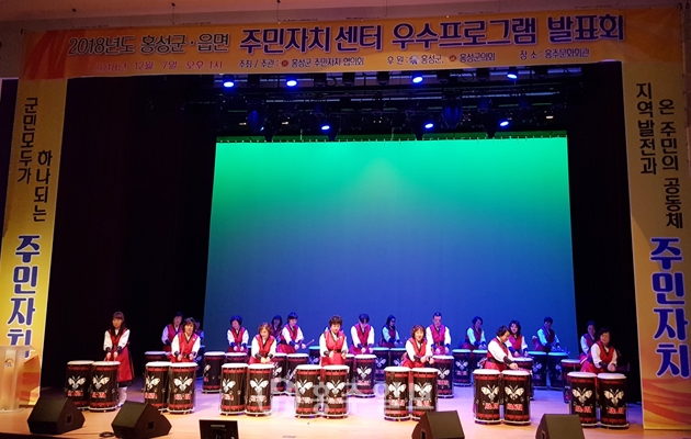 2018년 홍성군주민자치센터 우수 프로그램 발표회가 지난 7일 홍주문화회관에서 열렸다. 이번 발표회는 박상도 씨의 아코디언 공연, 홍성읍의 한국무용 등의 식전공연에 이어 각 읍·면 우수프로그램, 구항면 농악, 장곡면 합창, 홍북읍 난타, 결성면 요가, 홍성읍 줌바댄스, 홍동면 난타, 은하면 요가, 서부면 라인댄스, 금마면 노래교실, 광천읍 색소폰, 갈산면 필라테스 발표회가 진행됐다.