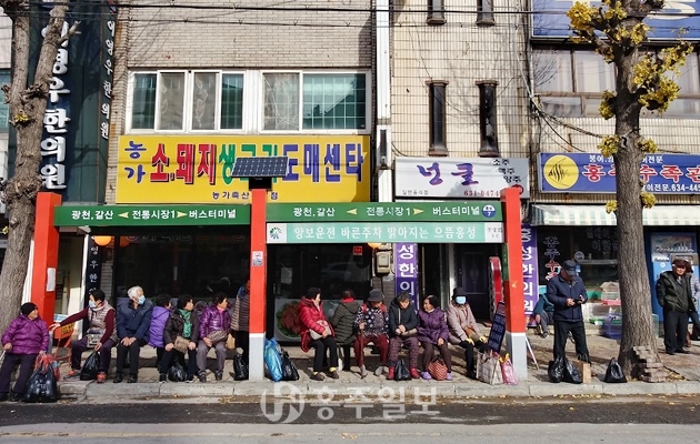 장을 보러 나온 어르신들이 버스 정류장에 옹기종기 앉아 버스를 기다린다. 앞으로 앉고 뒤로 앉고 그마저 자리가 없어 보도블럭에 앉아보기도 하고, 나무에 기대 앉아보기도 한다. 날은 추운데 ‘버스는 언제 오려나’하는 마음에 한 곳으로 시선이 향한 어르신들이다. 겨울이 오면 손바닥만한 양지 하나가 간절해진다. 서로 모르는 사람이지만 어깨를 맞대 사람의 온기에 몸을 녹인다.