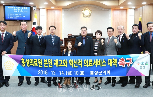 홍성군의회가 홍성의료원 충남대병원 위탁운영과 내포신도시 내 종합병원 응급의료센터 설립을 촉구했다.<사진> 군의회는 제256회 홍성군의회 정례회 폐회식에서 홍성의료원 분원 재고와 혁신적 의료서비스 대책을 촉구하는 성명서를 발표하고 이같이 밝혔다.