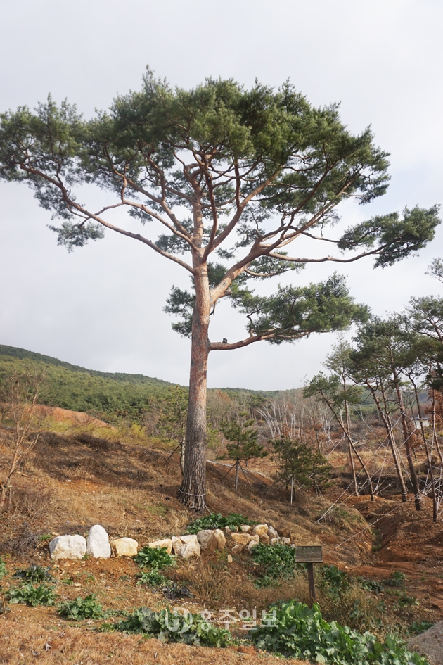 지난 2주 동안 소개된 보호수들과 함께 서부면 판교리 임득의 장군의 사당과 묘소가 있는 ‘정충사’ 근처에 위치한 수령 260여 년으로 추정되는 이 소나무는 2012년 보호수(지정번호 2012-02)로 지정된 당산목이다. 나무높이는 약 18m이고 나무둘레는 250cm가량이다. 주인 임철환 씨는 “정충사 앞과 옆에 있는 보호수들과 함께 관리 중”이라며 “산 중턱에 다른 나무들과 위치해있어 보호수라는 표시가 있었으면 좋겠다”고 말했다. 임 씨의 말처럼 보호수 주변이 조경석이나 울타리 등으로 다른 나무들과 구분이 돼있지 않으며, 안내판 역시 준비돼 있지 않다. 보호수의 건강상태는 매우 양호해보인다.