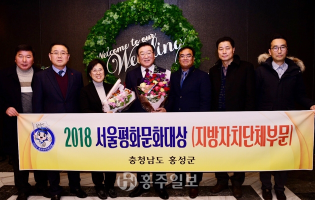 군이 지난 14일 서울 여의도 켄싱턴 호텔에서 열린 2018년 서울평화문화대상 지방자치단체 부문에서 대상 수상의 영예를 안았다.<사진>