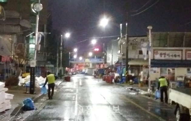새벽 5시, 청소부 김 씨의 하루 일과가 시작된다. 겨울이 되면 청소 일은 조금 더 힘들어진다. 추위와 눈과의 싸움이기 때문이다. 춥기 때문에 아무리 새벽이라도 속을 채우고 나온다. 뜨뜻한 무국에 밥을 한 술 말아 훌훌 삼킨다. 위아래 모두 내복을 입고 두툼한 점퍼를 껴입고 집을 나선다. 사방이 깜깜하다. 쥐새끼 한 마리 보이지 않는다. 익숙한 어둠이다. 그러나 김 씨는 알고 있다. 그 어둠 뒤에 숨은 찬란한 여명의 빛을 말이다. 사무실에 도착해 믹스커피 한 잔을 마신다. 5시 13분, 홍성시장에 도착한다. 왼손에는 파란색 비닐봉투를, 오른손에는 집게를 들고 박 씨와 함께 걷기 시작한다. 집게로 쓰레기 특히 담배꽁초를 줍는 일은 보기보다 쉬운 일은 아니다.