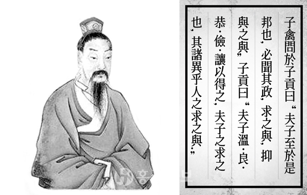 자금(子禽)이 자공(子貢)에게 물었다. “부자(夫子)께서는 한 나라에 이르실 적마다 매번 반드시 그 정사(政事)에 대해 들으셨다고 하는데, 부자 쪽에서 (그런 자리를) 구했기 때문입니까. 아니면 저쪽에서 (자리를 마련해) 주었기 때문입니까?” 자공이 대답했다. “부자께서 온후(溫厚)하시고 선량(善良)하시며 공손(恭遜)하시고 검약(儉約)하시고 겸양(謙讓)하셔서 (그런 자리를) 얻게 된 것이니, (夫子께서 그런 자리를 구하셨다 해도) 부자(夫子)의 구하심은 그 여느 사람들의 구함과는 다르다네.”