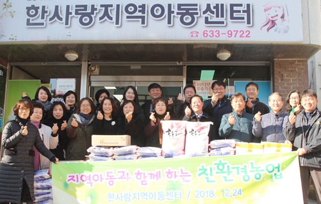 한국친환경농업인협회와 친환경농산물 의무자조금관리위원회가 한사랑지역아동센터에 지난달 24일 친환경 쌀 100포대를 기증했다.<사진>