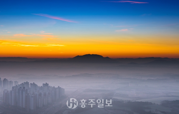 2019년 1월 1일 새해 아침 용봉산에서 내려다 본 충남도청 내포신도시 전경, 희미하게 날이 밝아오며 새해 희망의 빛을 전하고 있다.